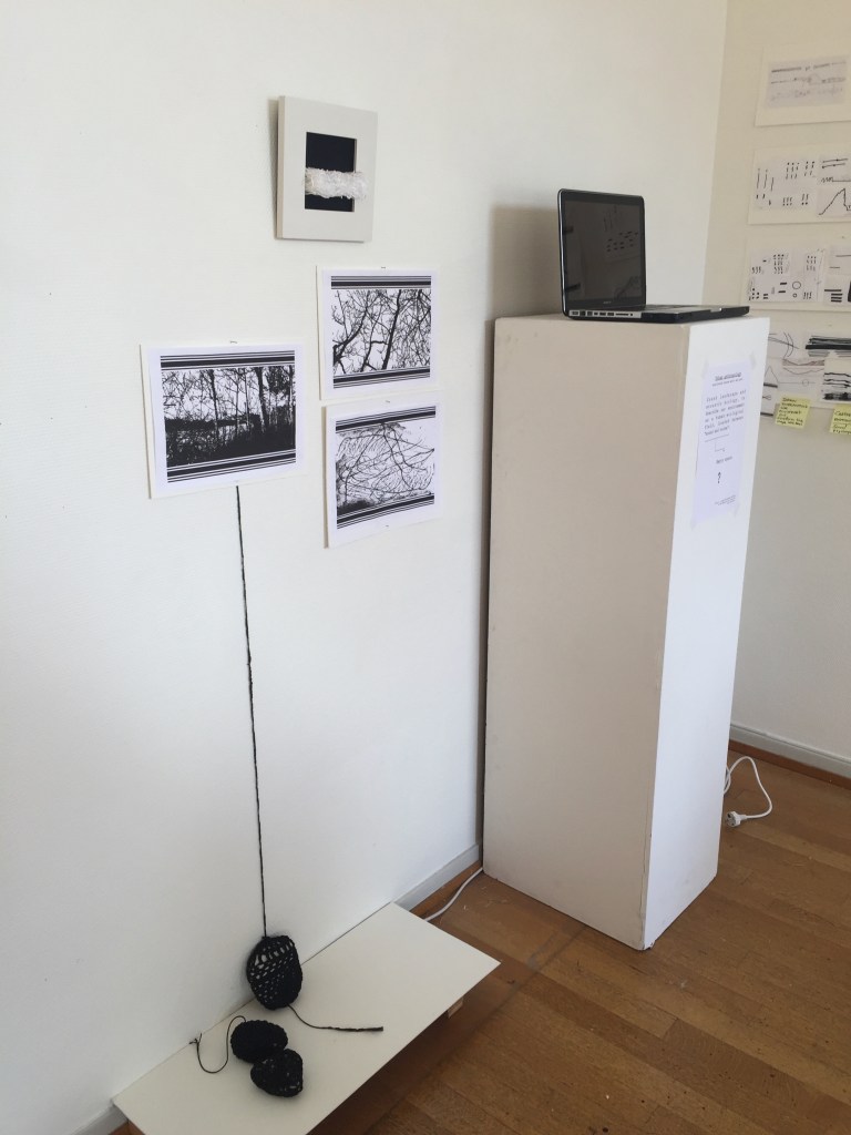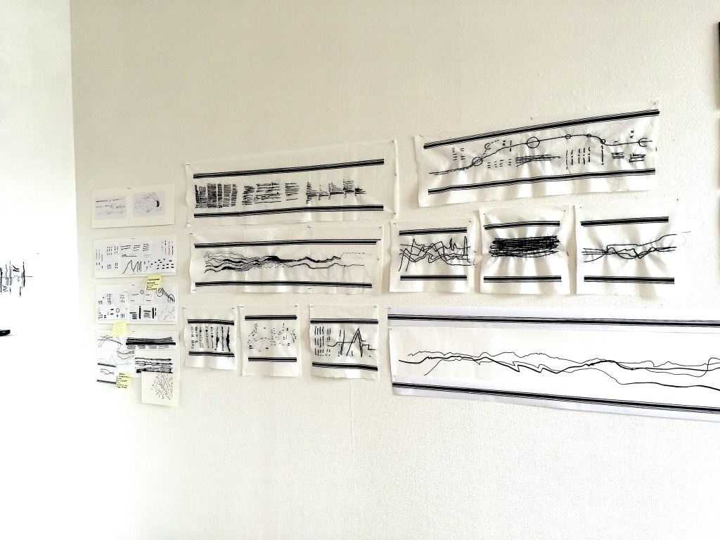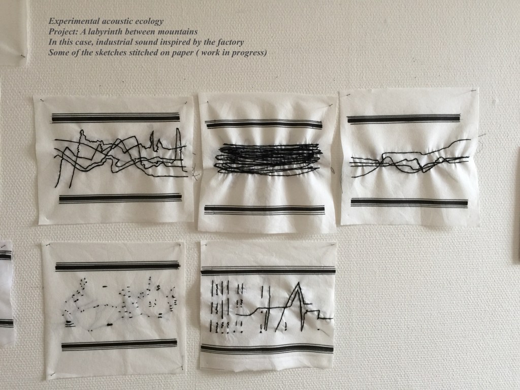 b) Experimental acoustic ecology / Graphical representation of landscape in sound code. c)Video made with all the drawings and sketches of the sound graphics.